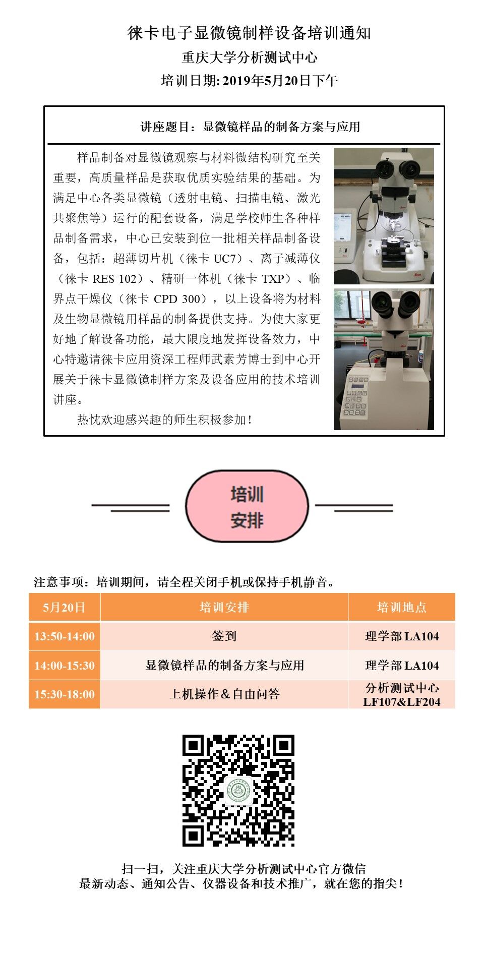 此次培训相关制样设备将于5月23日至5月31日免费开放试运行,欢迎有需求的老师和同学前来中心咨询、使用。