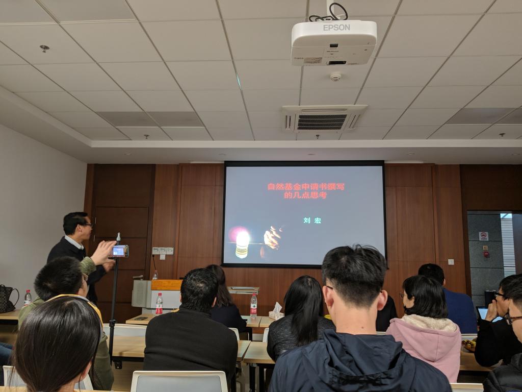 在会上,刘宏教授为参会老师作了《自然基金申请书撰写的几点思考》的辅导报告。在第一部分,刘宏教授首先从政策解读、指南阅读、研究方向定位、前期研究开展等四个方面介绍了国家自然科学基金申请前的准备。在第二部分,刘宏教授详细讲解了自然基金申请书撰写,包括选题原则与技巧、内容确定、题目、摘要、主体内容、主要内容、立项依据、研究内容、拟采取的研究方案及可行性分析、本项目的特色与创新之处、工作基础与工作条件、预期成果、研究计划等具体内容,并对中心老师提出的问题进行了认真解答。