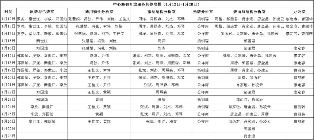 分析测试中心作为校级大型仪器设备公共服务平台,秉承为全校师生提供高效、优质测试服务的宗旨,坚持寒暑假全年无休向校内外开放。2022年寒假期间中心正常开放运行,每天可接收样品,欢迎校内外师生前来预约测试。如您有紧急测试样品,请直接联系值班老师说明需求。
