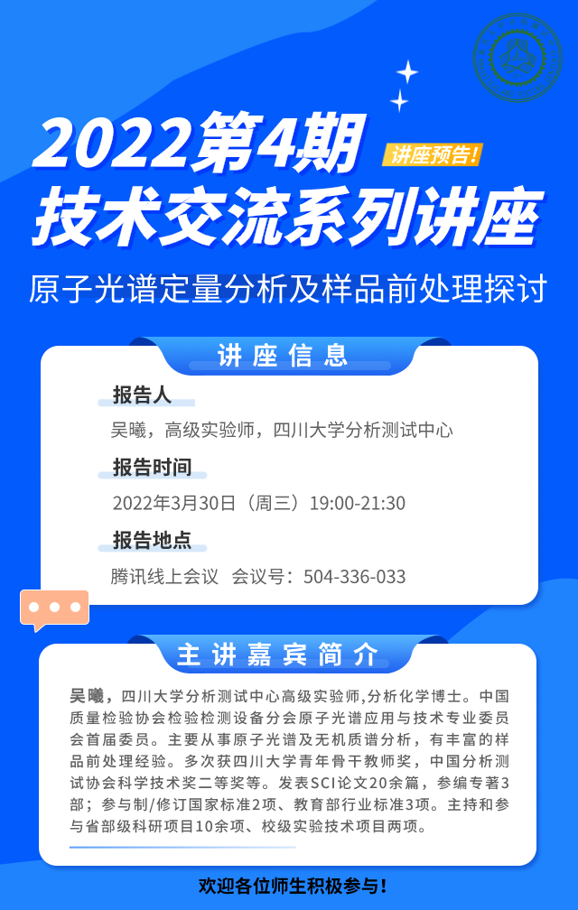电感耦合等离子体发射光谱(ICP-OES)专题讲座,3月30日晚19:00开讲啦!欢迎大家前来腾讯会议室交流,腾讯会议号:504-336-033。