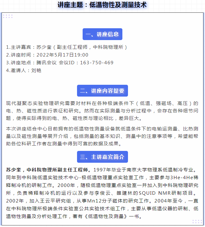 分析测试中心通用物性分析室将于5月17日至18日开展三场技术交流系列讲座(2022年第8-10期),涉及成分分析、低温物性、热分析,热诚欢迎感兴趣的校内外用户积极参加。