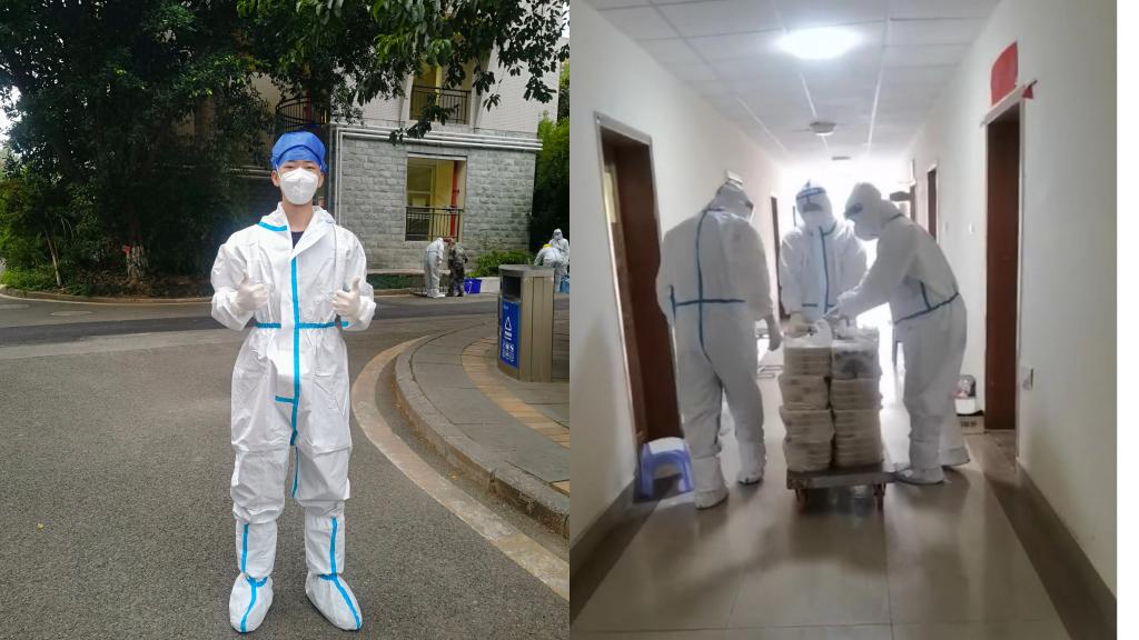 此次入校,刘杰作为“竹五突击队”第二突击队队员,在为期4天的抗疫服务工作中,主要负责为竹园五栋制动的学生们运送早中晚餐食以及生活物资。由于当时竹园五栋属高风险区,环境监测为阳性,突击队队员工作时必须身着防护服,做好防护措施。“在这个过程中,有许多艰辛、疲惫,但更多的是感动、温暖”,刘杰说:“当我穿戴好防护服和防护面具的那一刻,憋闷的感觉瞬间席卷而来,略微用力就会出汗,密不透风的防护服也好似一个桑拿房,不过在听到相隔一门之后的同学们的感谢后,我深受鼓舞,身体里好似有用不完的力气。我一直想着只要向前一步,就能争取最后的胜利早日到来。”