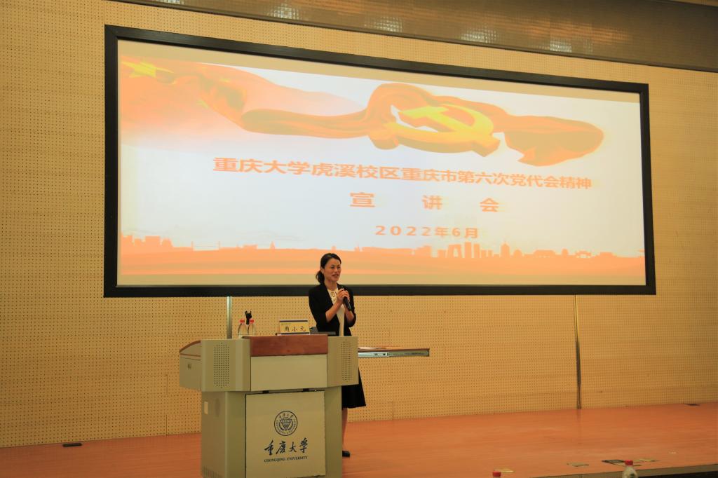 为深入学习贯彻重庆市第六次党代会精神,推动大会精神在虎溪校区落地见效,2022年6月16日下午,在虎溪校区综合楼126报告厅举办重庆市第六次党代会精神宣讲会,市第六次党代会代表、重庆大学分析测试中心主任周小元同志传达大会精神。虎溪党工委、外国语学院党委、数学与统计学院党委、物理学院党委、化学化工学院党委、大数据与软件学院党委、药学院党委等7个二级党组织,共计200余名师生党员参加宣讲会。宣讲会由虎溪党工委副书记韦迎春同志主持。