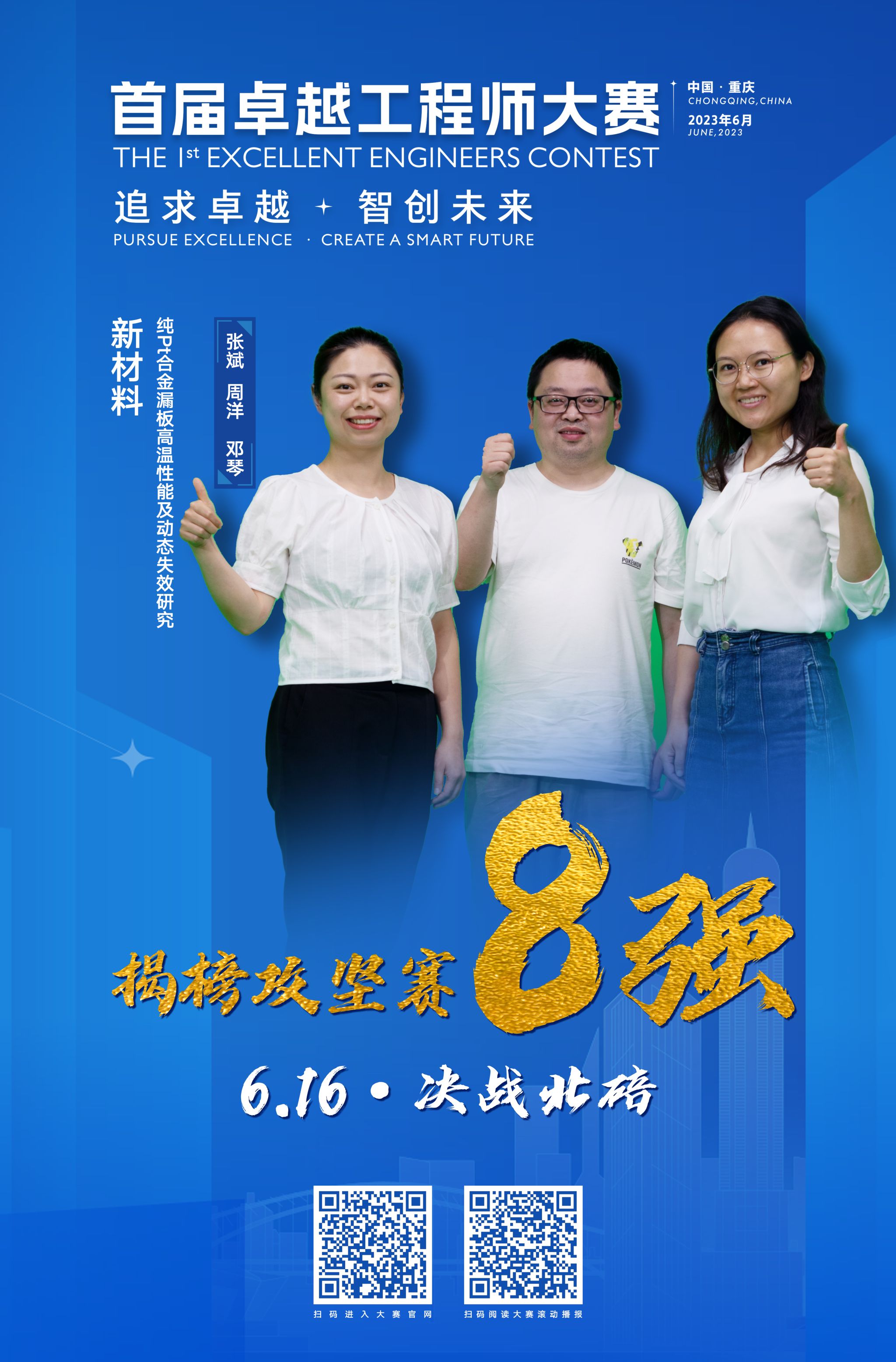 重庆大学分析测试中心张斌(项目负责人)、周洋(技术负责人)、邓琴领衔的“跨尺度多维度精准成像平台团队”(微纳结构分析室)揭榜重庆国际复合材料股份有限公司发布的攻坚项目“Pt合金漏板高温性能及动态失效研究”。此前该团队通过初赛、半决赛的出色表现从300多个团队中脱颖而出顺利晋级8强,并在揭榜攻坚赛决赛中赢得优胜奖。