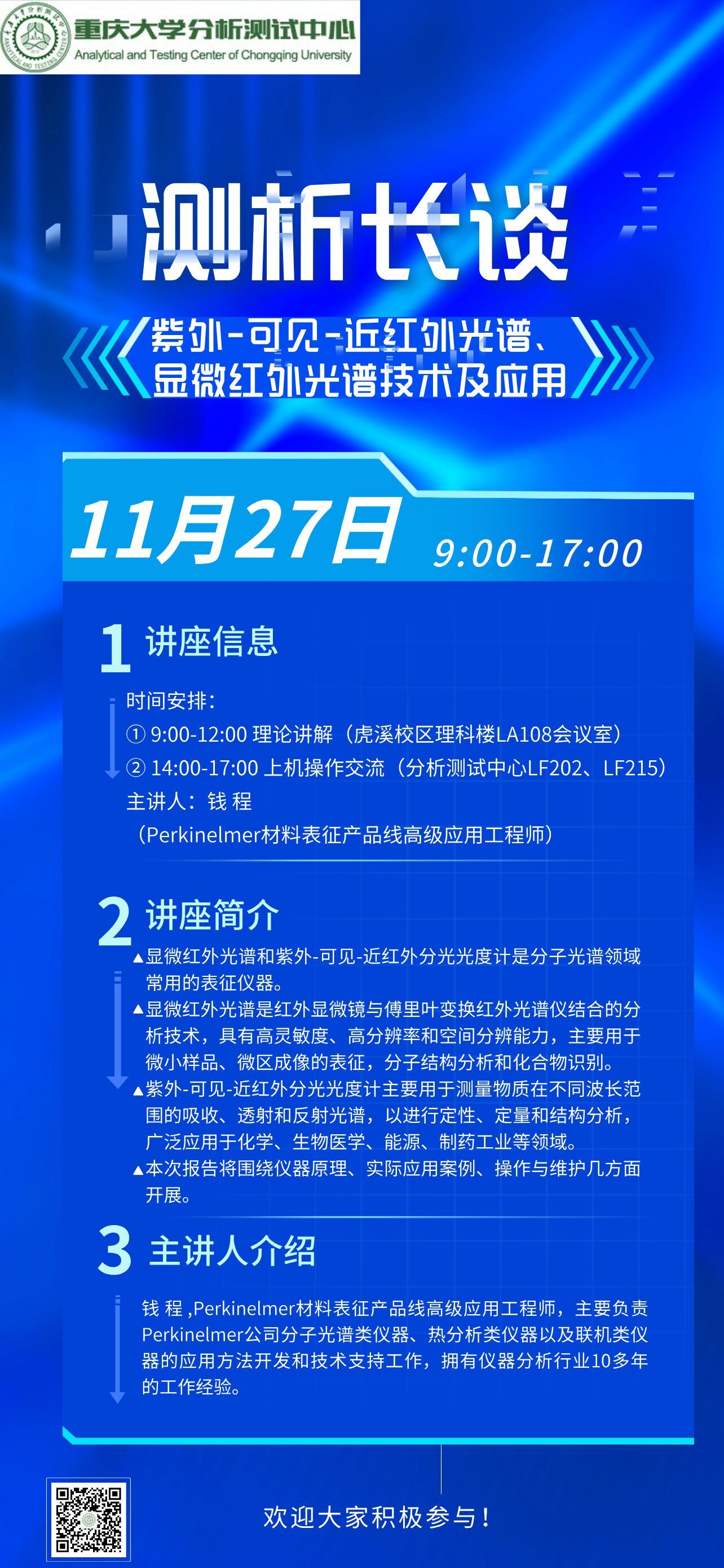 分析测试中心于11月27日(周三)开展紫外和显微红外技术讲座与培训,本次讲座将围绕仪器原理、实际应用案例、操作与维护等方面展开,欢迎校内外用户积极参加!
