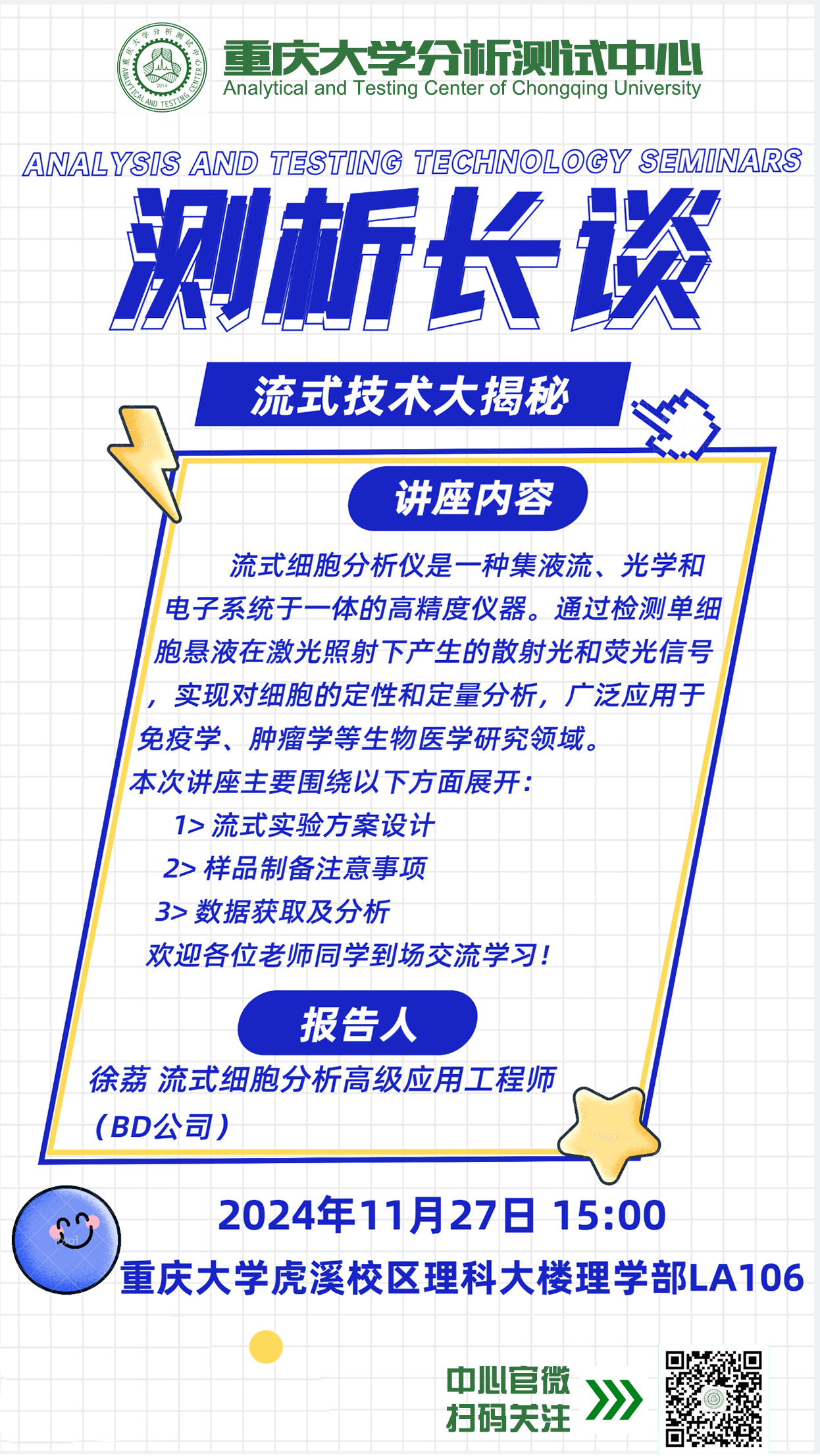 分析测试中心于11月27日(周三)下午15点开展流式细胞仪技术讲座与培训,本次讲座将围绕流式实验方案设计、样品制备、数据获取与分析等方面展开,欢迎校内外用户积极参加!
